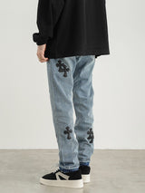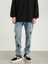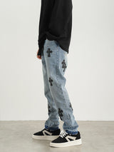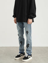 The 01 Cross Denim is constructed in a relaxed fit through the thigh that slightly tapers from the knee to the ankle. Featuring a button fly closure at the waist, a warm wash, and poly-leather cross graphics throughout.