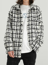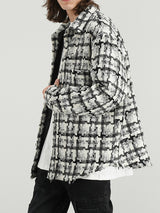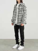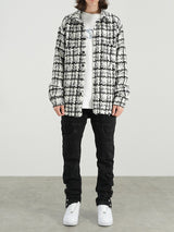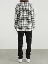 The Frayed Flannel is constructed in a relaxed fit, featuring a dynamic check pattern, button closure, and raw hem.