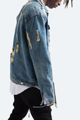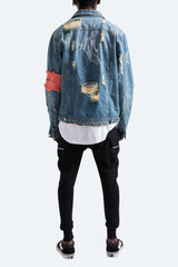 The "hand of god" denim jacket is constructed in a relaxed fit. the jacket features button pockets on the chest, an adjustable draw-belt at the waist, distressed details throughout, and a spectral graphic on the back.