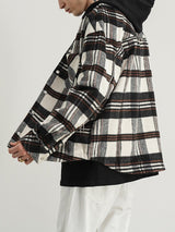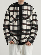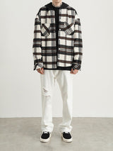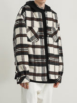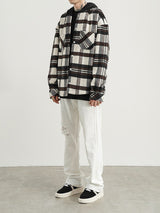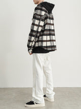 The Hooded Flannel Jacket is constructed in a relaxed fit throughout, featuring pockets at the chest, button closure placket, and a french terry hoodie.