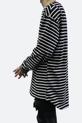 The Striped L/S is constructed in a relaxed fit with a custom striped cotton fabric, featuring a scalloped hemline and drop shoulder design.