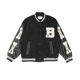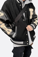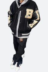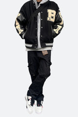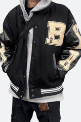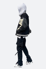 The Varsity Jacket is developed in a relaxed fit and constructed with a poly-leather fabric. The jacket features embroidery at the chest and sleeves, contrast striping and ribbing at the collar, wrist, and waist as well zipper pockets at the waist.