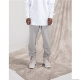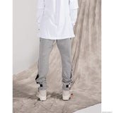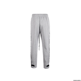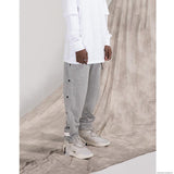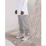 The warmup snap sweats feature snappable buttons on both outerseams and a relaxed & baggy fit as well as an elastic waist with a fastened drawstring.