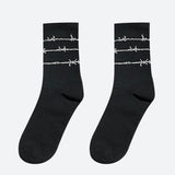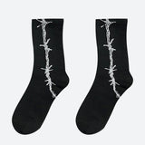The Wire Socks feature a vertical and horizontal barbed wire graphic. one size fits most.