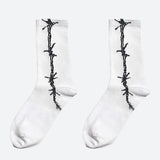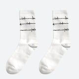 The Wire Socks feature a vertical and horizontal barbed wire graphic. one size fits most.